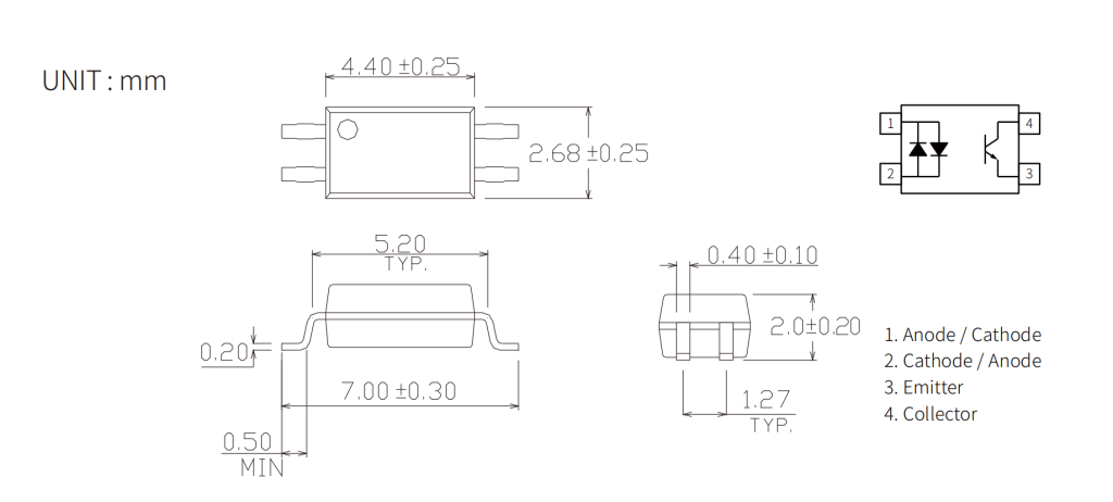 | Product | Package | size(LxWxHmm) | VF (V) | BV CEO (Min) (V) | V CE(SAT) (Max) (V) | IF (mA) | CTR (%) | tr (uS) | tf (uS) | ton (uS) | toff (uS) | Topr (Min) (degC) | Topr (Max) (degC) | Viso (Vrms) |